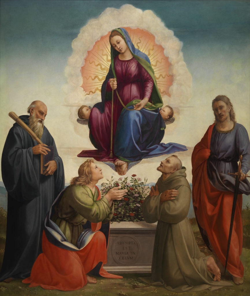 The theme of the gift of the girdle to St. Thomas is a very popular iconography of the turn of the fifteenth and sixteenth century, especlially in Tuscany and central Italy.