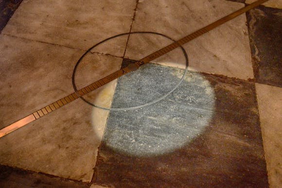 Un disco di luce proiettato dal foro gnomico sta per raggiungere il punto indicato per l'Equinozio (Foto Maurizio Rufino)